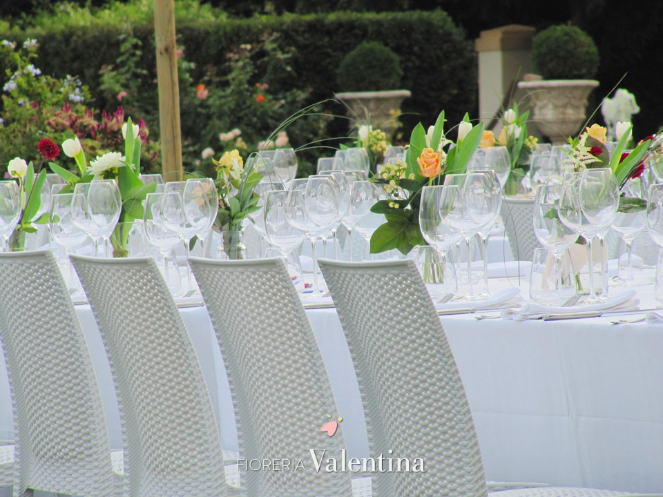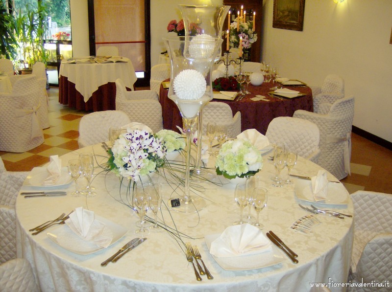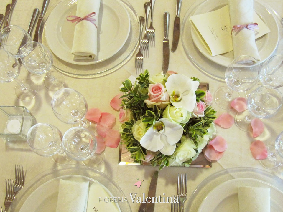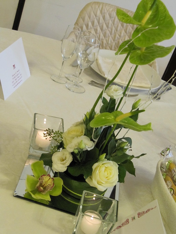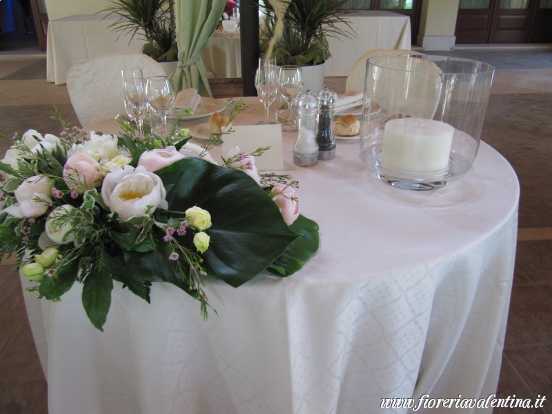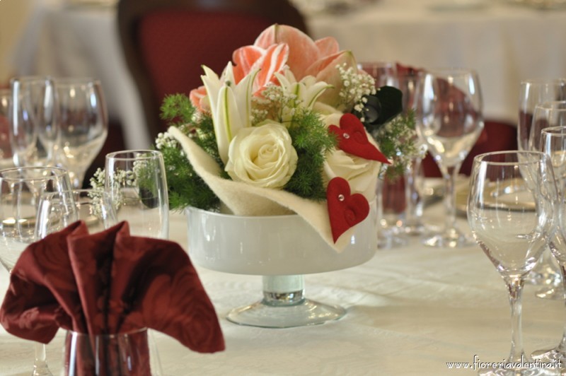 Tavolo imperiale: tulipani bianchi, rosa arancioni e fiori rossi