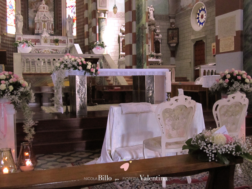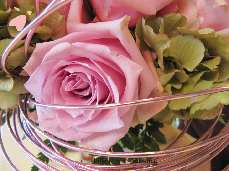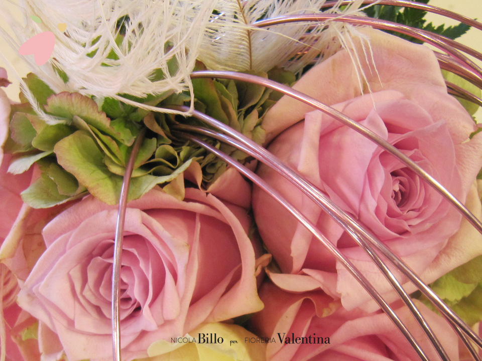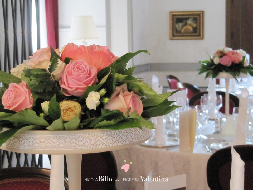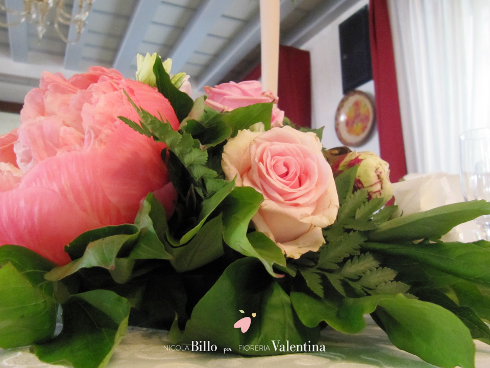 Lisianthus tra rose rosa e velo da sposa, un allestimento da sogno