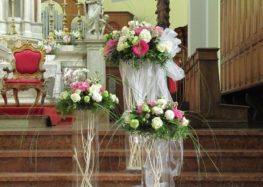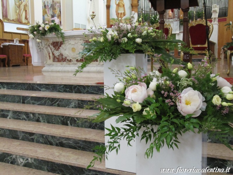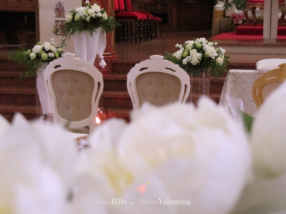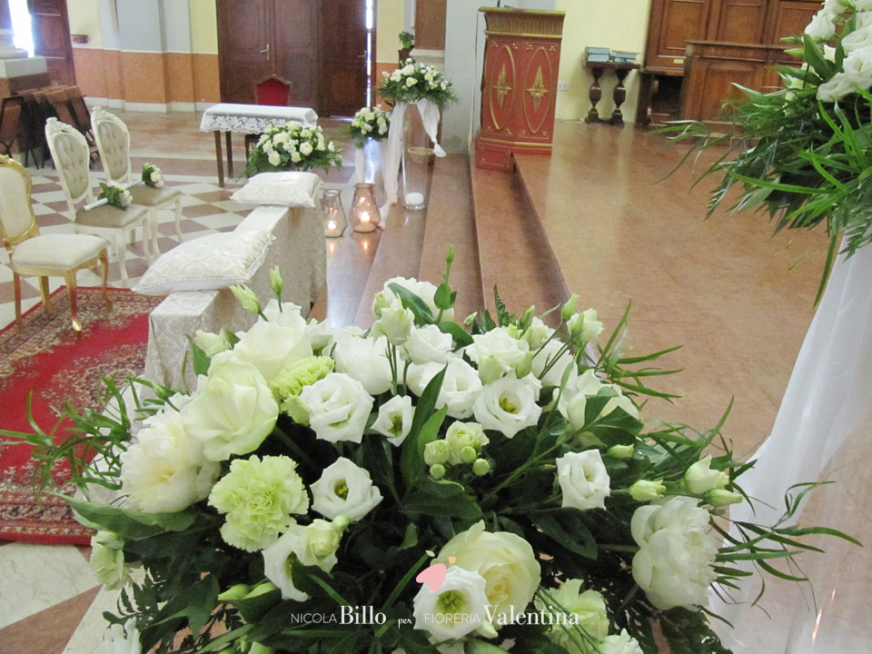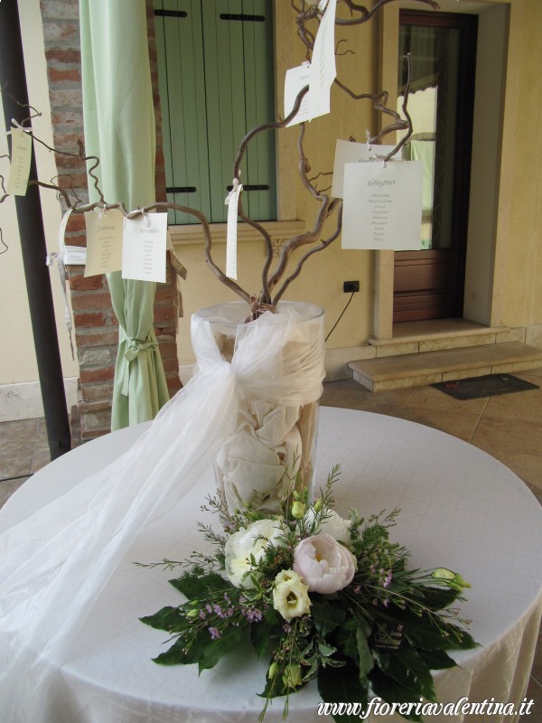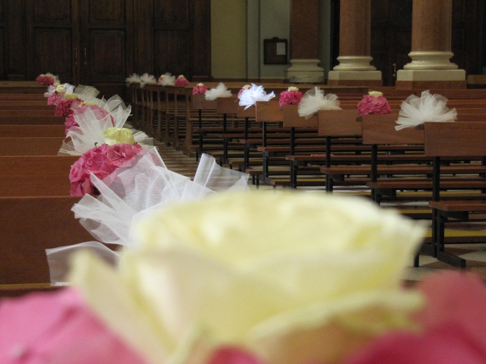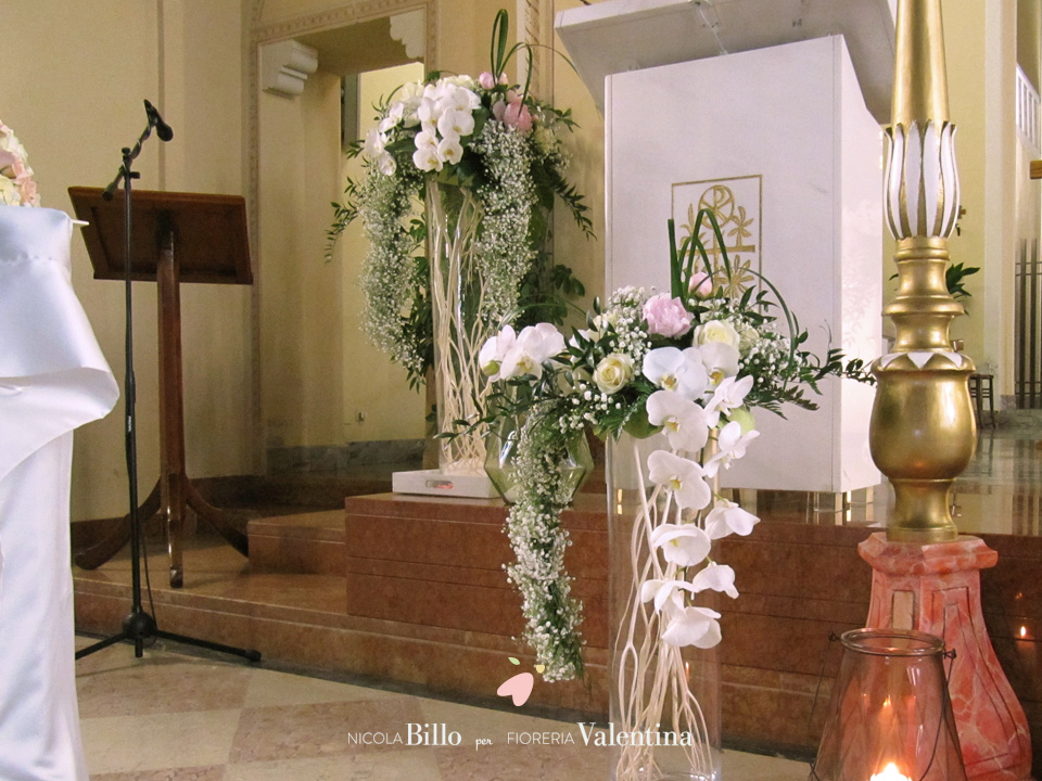 Lisianthus tra rose rosa e velo da sposa, un allestimento da sogno