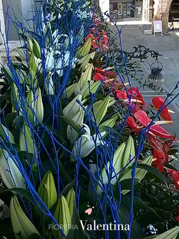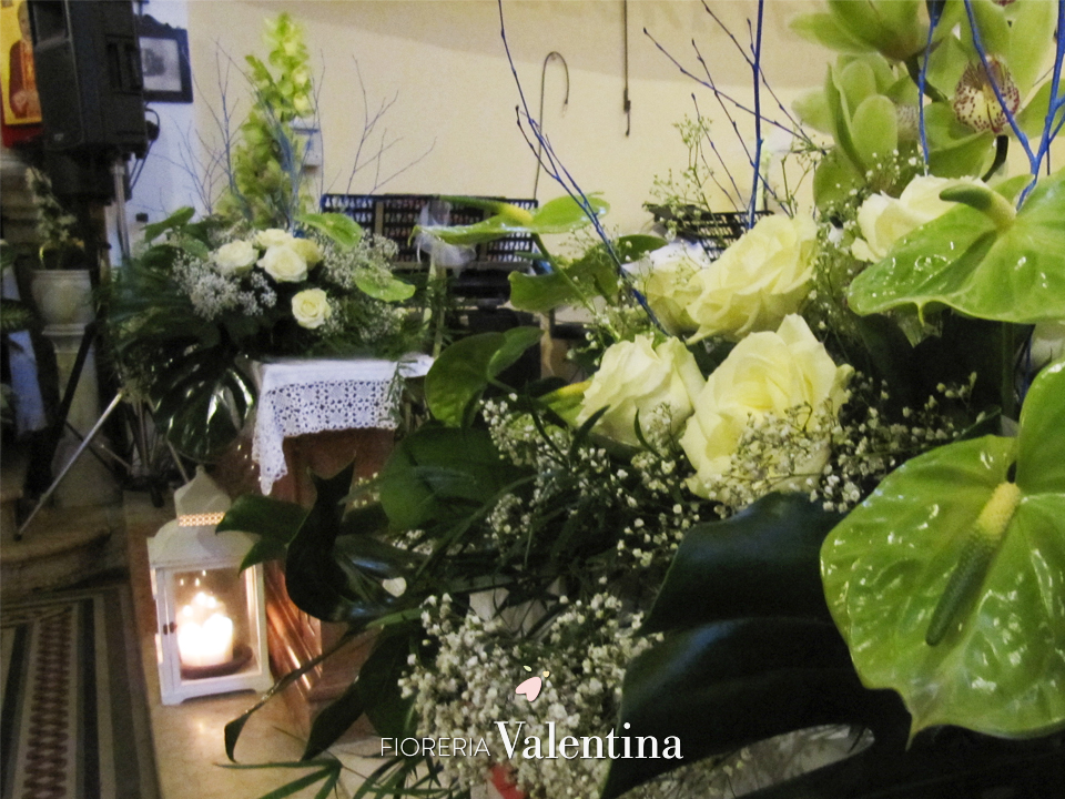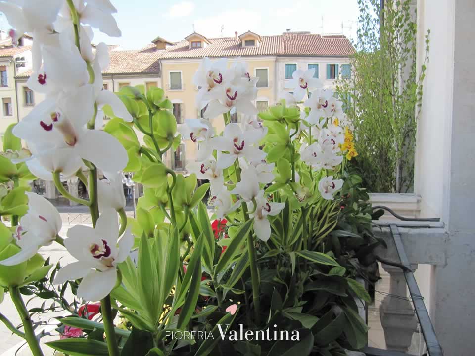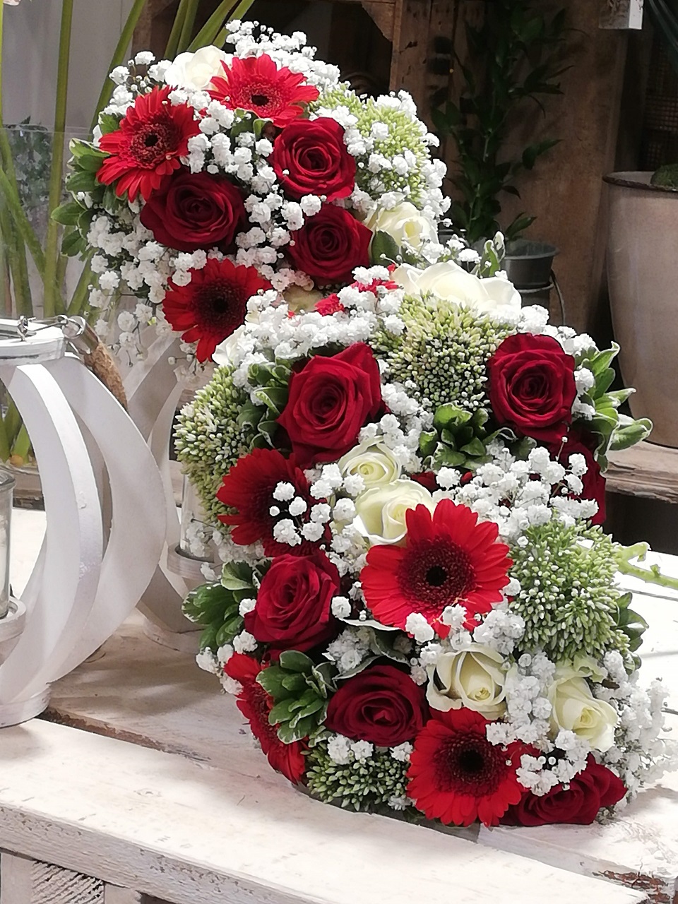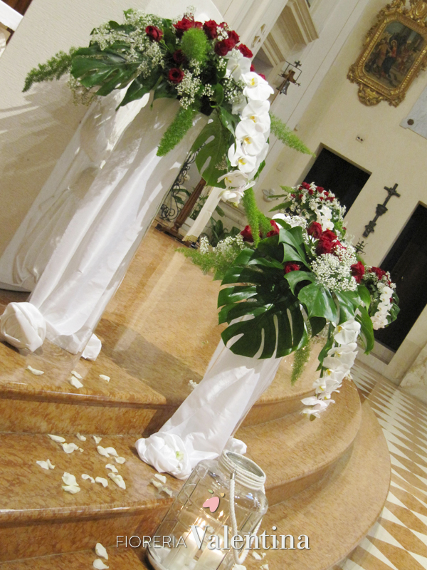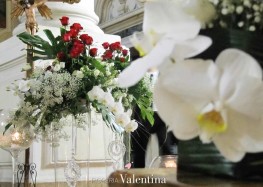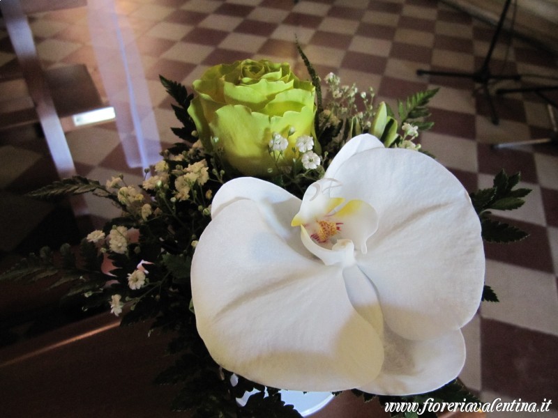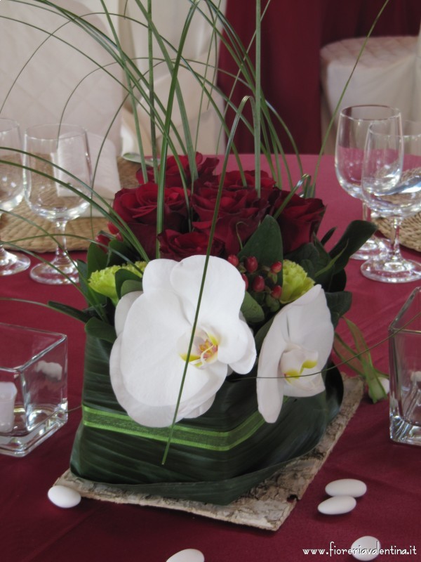 Amore, passione, purezza, rose rosse, orchidee bianche e gypsophila