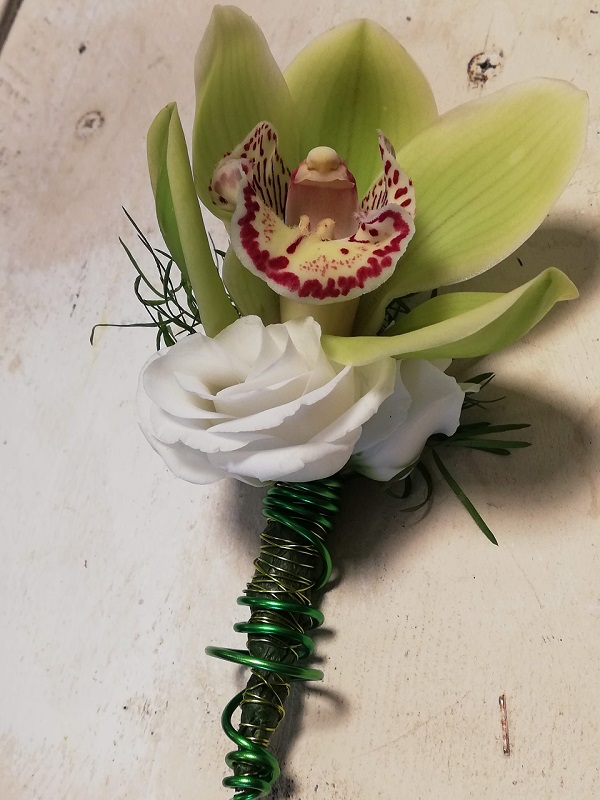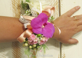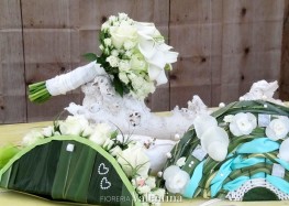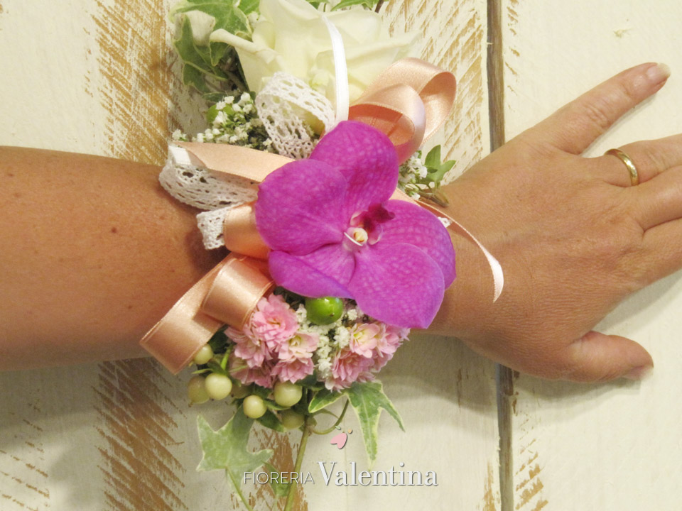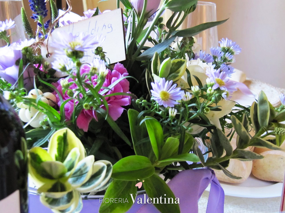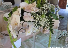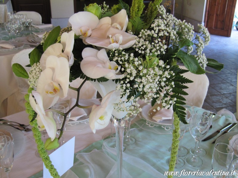Orchidee bianche, gypsophila, lisianthus e rose lavanda