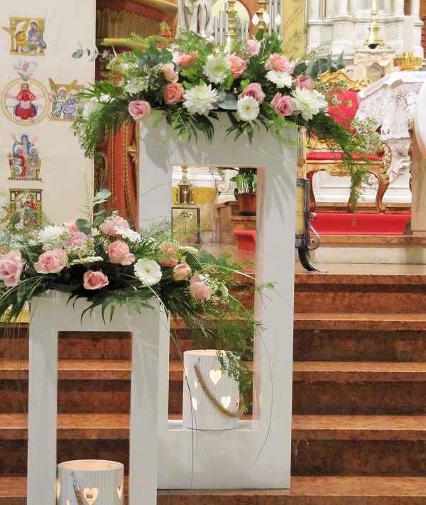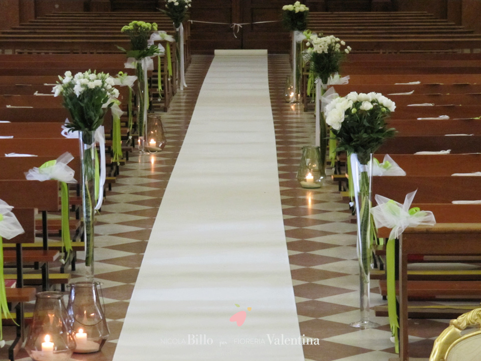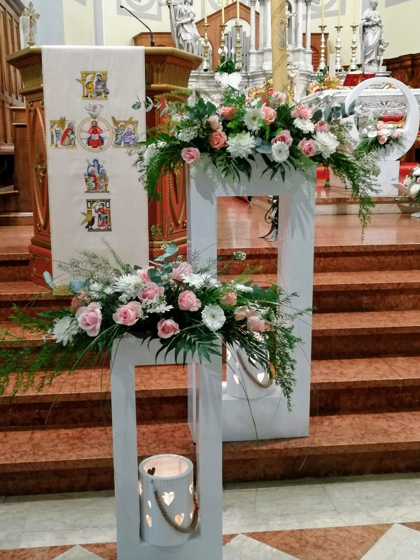 Bianco, rosa pastello e verde: l’eleganza dei lisianthus tra rose rosa e velo da sposa