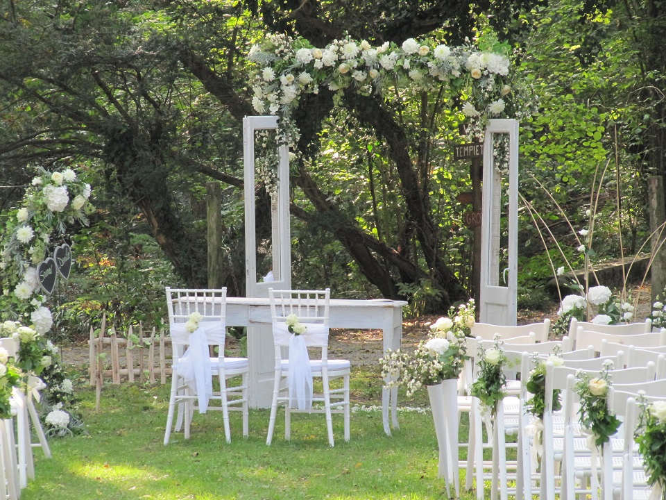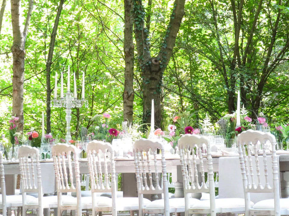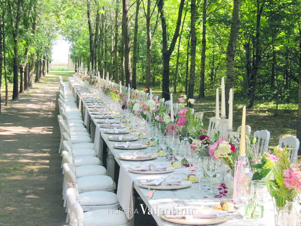 Una tavolata imperiale tra lisianthus bianchi, rosa, bacche in toni pastello e il verde trionfale della natura
